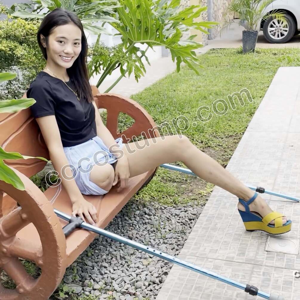 Watch beautiful Cathy high RAK, wearing a black mesh top and a cute blue mini skirt. See her crutching with blue forearm crutches and a high heeled shoe around the house and pool. Fantastic stump view scenes while resting. Awesome Cathy.