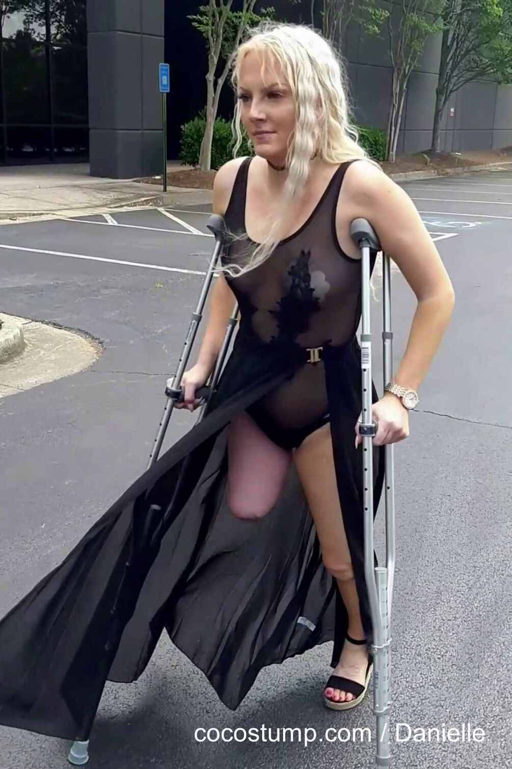 Watch awsome Danielle in this great crutching sampler in different outfits. Danielle is crutching outside in the woods, in the backyard and on a parking place in front of a shopping mall. She also uses diffrent slippers, heels and is also crutching barefoot. Great crutching scenes for all lovers of crutches and good stump scenes. Video is in portait format.