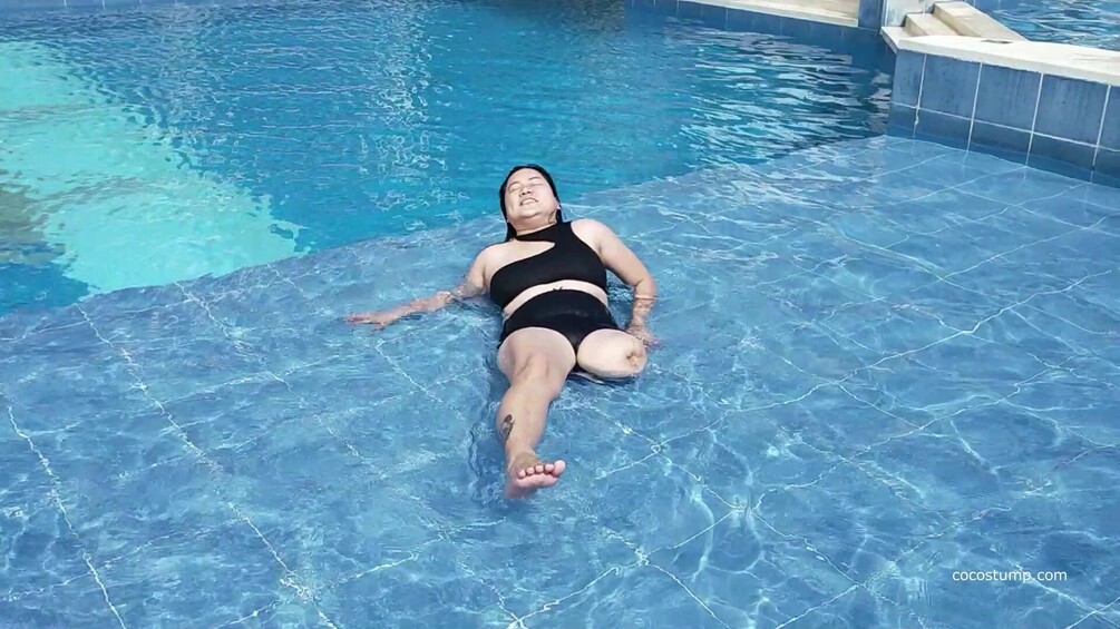 Watch Jewel crutching and relaxing in and around the pool wearing a black 2 piece swimsuit. Enjoy the great stump views and Jewel's smiles.