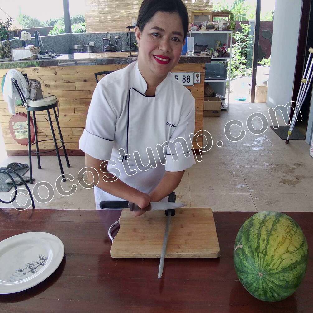 Watch beautiful Laura, double hand amputee how she is preparing a melon. Laura can do everything without her hands, nothing is stopping her. Watch her sharpening her knife and cutting a melon piece by piece. Great first video of chef Laura.