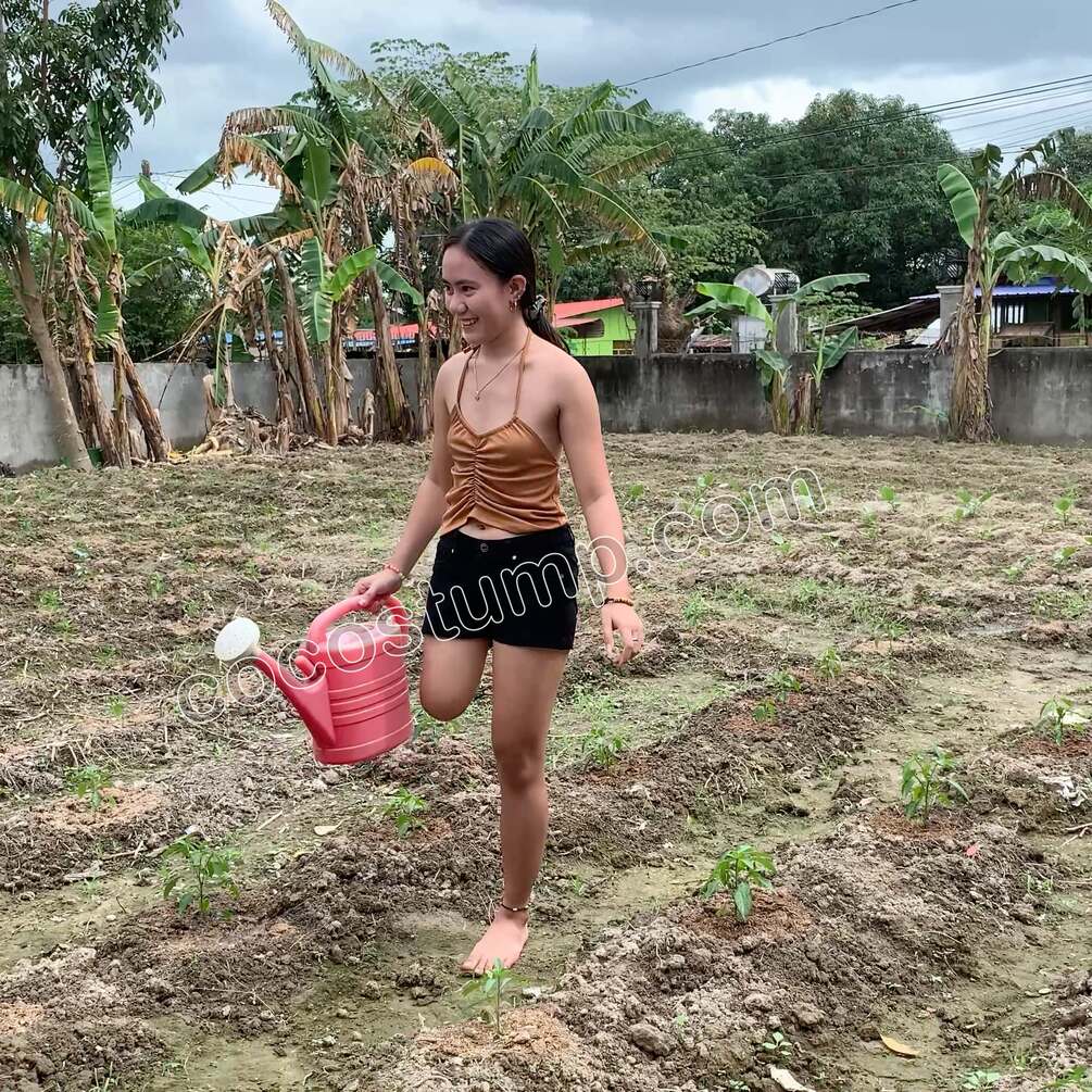 Vanessa RAK is wearing black shorts and a nice top. She is working in the garden watering the plants. See her elegant and fluent hoppers. Fantastic Vanessa video.