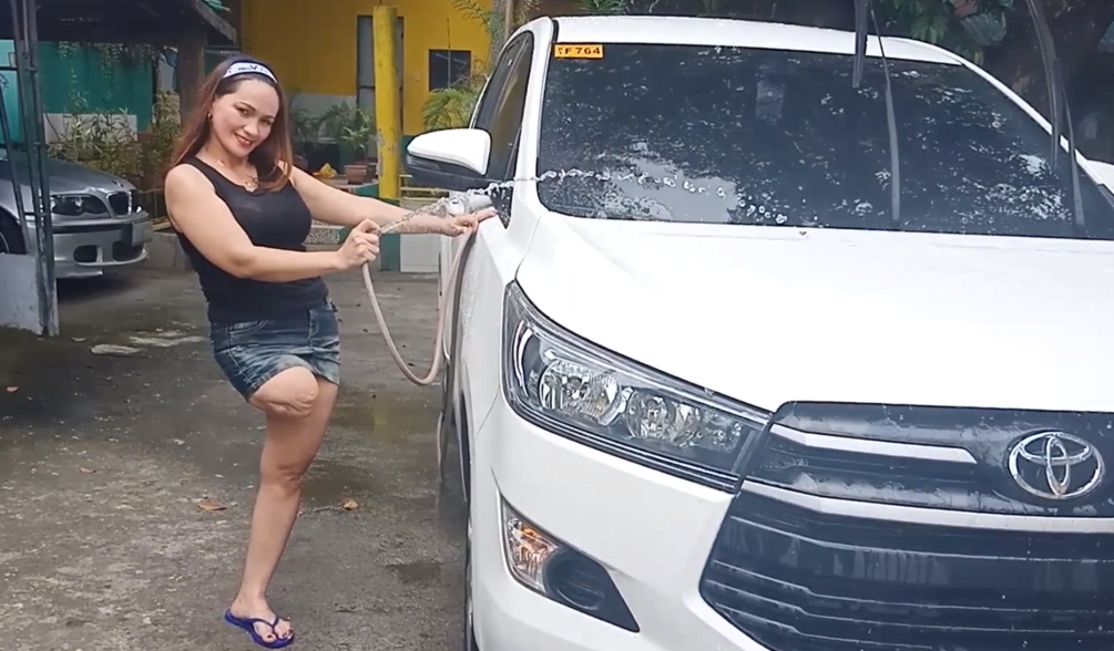 Hot Vernie wearing a Jeans Miniskirt and doing the car wash. Great stump views and hopping scenes.