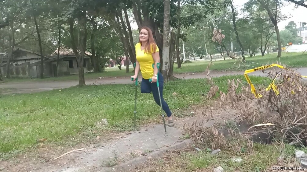 Vernie crutching around a haunted place. She is weaing some fold up jeans. Great cruching video.