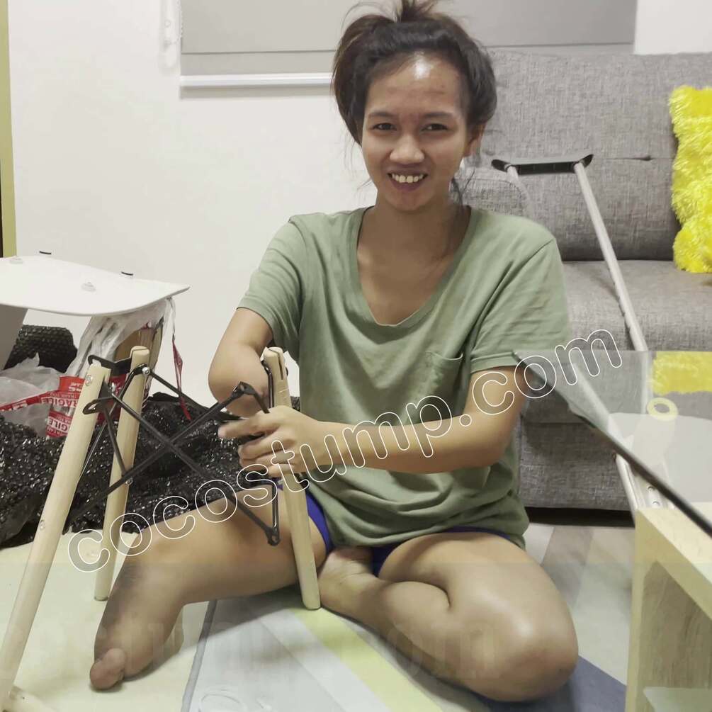 Watch beautiful Xialyn OOE, wearing a T-shirt and shorts. She is assembing furniture. Watch her acting with her stump and her 4 fingers. Very intersting and nice video with Xialyn.